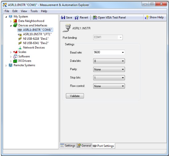 Open Measurement & Automation Explorer and select the communications port you would like to use.
