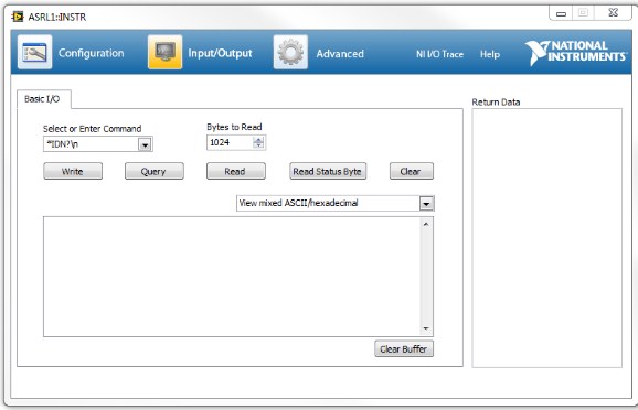 In the Basic I/O tab, click the Query command to send the default *IDN?\n command.