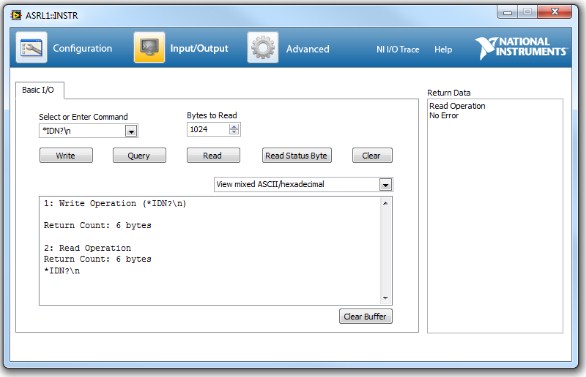 The display window will then outline the write and read operations. The Test Panel should have successfully read the sent *IDN?\n command.
