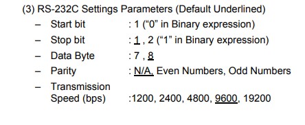 Rắc cắm kết nối thiết bị điều khiển: RS232 DB9 Female (chuẩn kết nối 9 chân 2 hàng âm thuật ngữ kỹ thuật RS232)