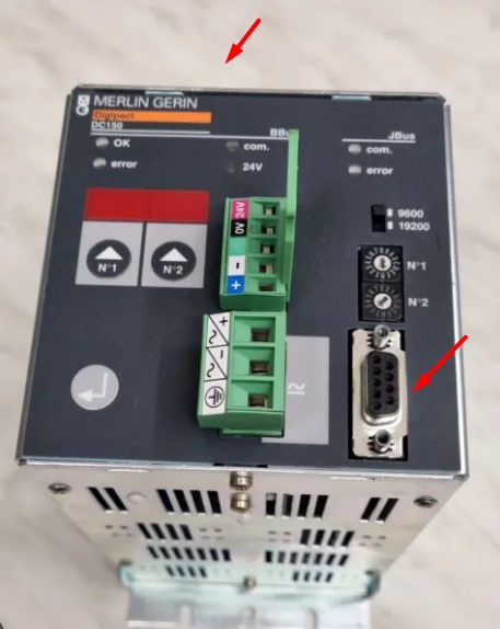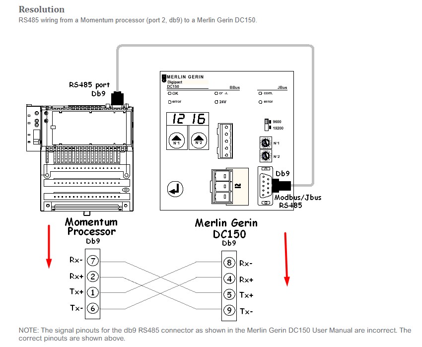 RS485 wiring from a Momentum processor (port 2, db9) to a Merlin Gerin DC150