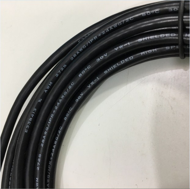 Thông số in nổi trên sợi cáp: E338413 AWM STYLE 2725 VW-1 80C 30V 28AWG/IP+24AWG/2C SHIELDER HIGH SPEED USB 2.0