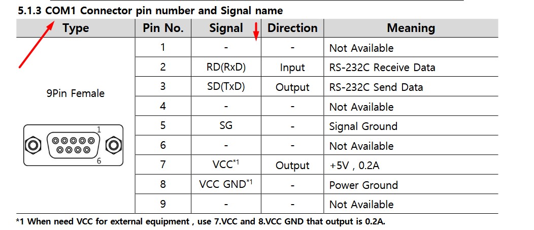 COM1 Connector pin number and Signal name