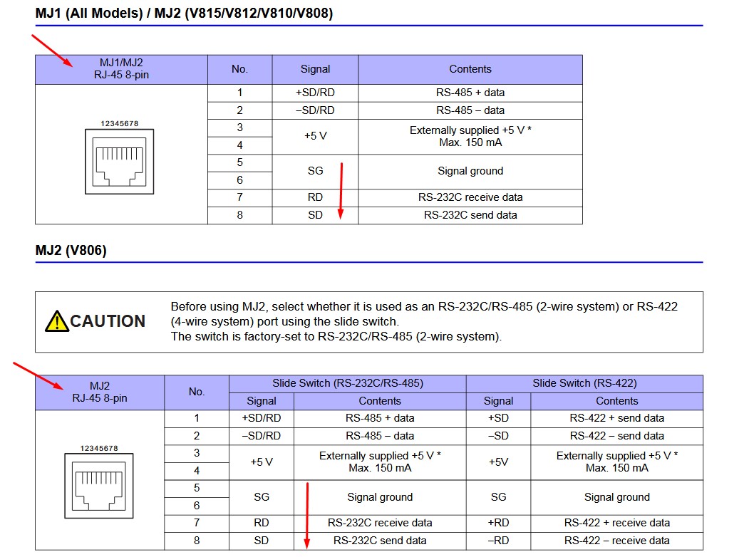 The MJ1 and MJ2 ports support communication via RS-232C, RS-422