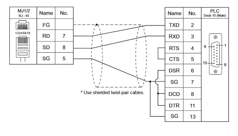 Wiring diagram RS232C Port MJ1/MJ2 RJ45 8 Pin to D-Sub 15 Pin Male 2 Row Communication Cable HMI Fuji Electric Monitouch V8 V9 Series and PLC Allen Bradley 1785-KE