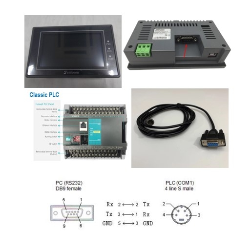 SK series touch screen uses DB9F connector. Haiwell E/S/H series PLC terminal is MD4M