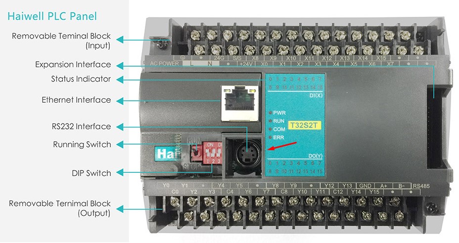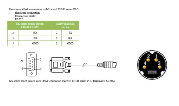 SK series touch screen uses DB9F connector. Haiwell E/S/H series PLC terminal is MD4M
