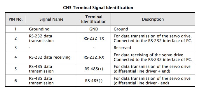 Cáp kiết nối giao tiếp nối tiếp CN3 được bố trí và nhận dạng thiết bị đầu cuối CN3 Ổ đĩa servo có thể được kết nối với PC hoặc bộ điều khiển thông qua giao tiếp nối tiếp này.