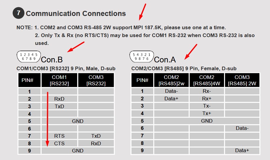 Port COM.B COM1 (RS232), COM2 (RS485 2W/4W), COM3 (RS232, RS485 2W)