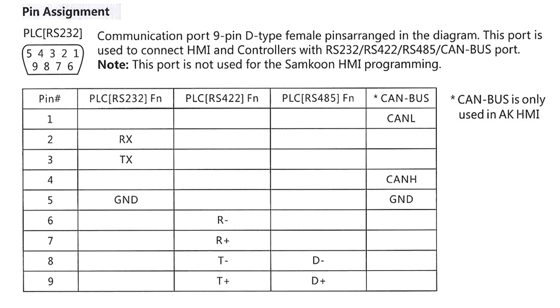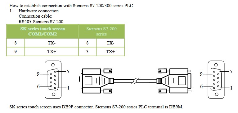 SK series touch screen uses DB9F connector. Siemens S7-200 series PLC terminal is DB9M