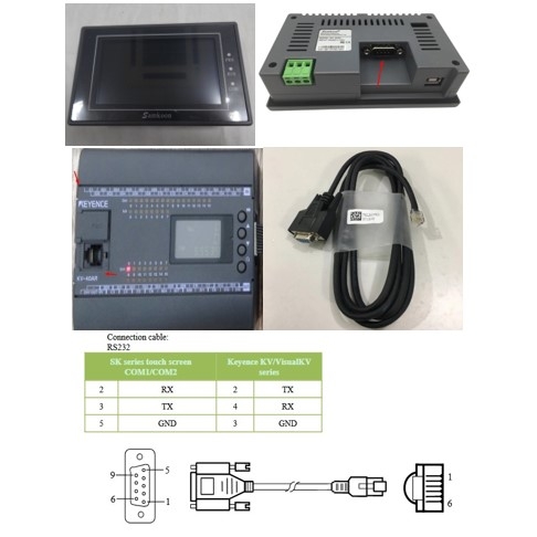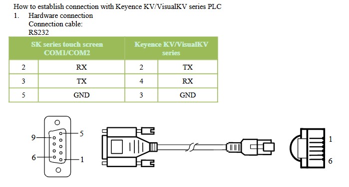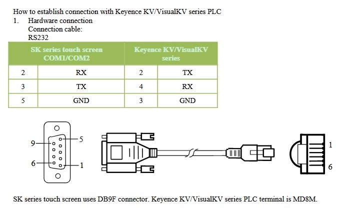 SK series touch screen uses DB9F connector. Keyence KV/VisualKV series PLC terminal is RJ12 6 Pin