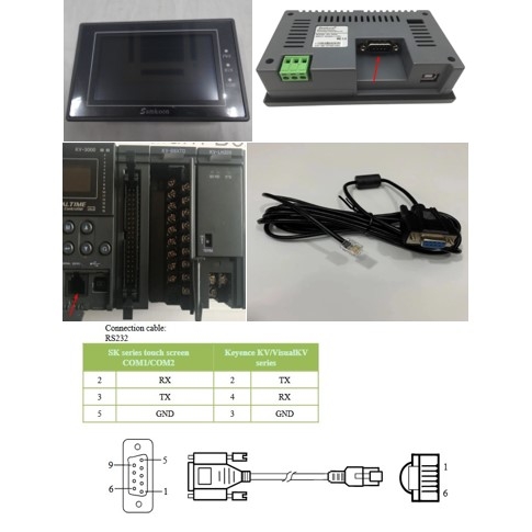 SK series touch screen uses DB9F connector. Keyence KV/VisualKV series PLC terminal is RJ12 6 Pin