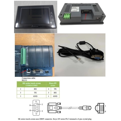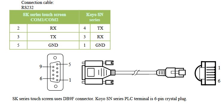 SK series touch screen uses DB9F connector. Koyo SN series PLC terminal is 6-pin crystal plug.