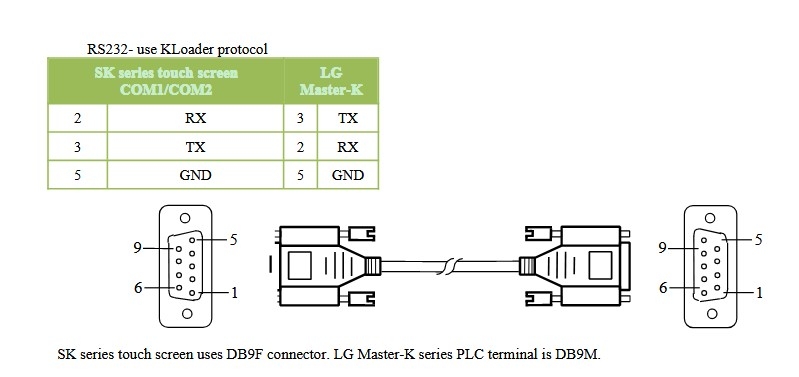 SK series touch screen uses DB9F connector. LG Master-K series PLC terminal is DB9M