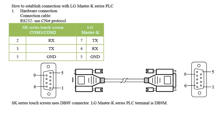 SK series touch screen uses DB9F connector. LG Master-K series PLC terminal is DB9M