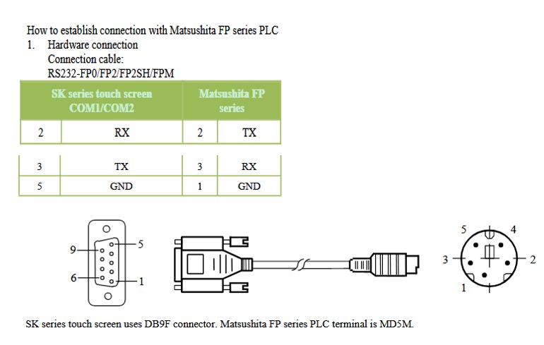 SK series touch screen uses DB9F connector. Matsushita FP series PLC terminal is MD5M