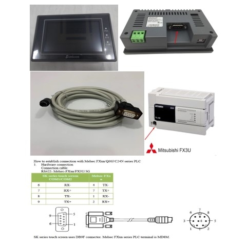 SK series touch screen uses DB9F connector. Melsec FXxn series PLC terminal is MD8M