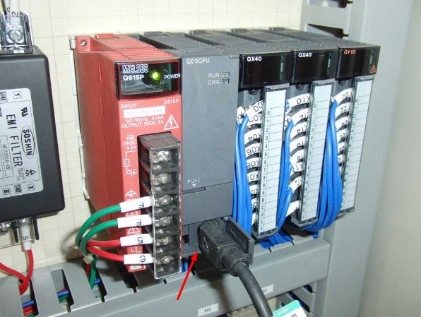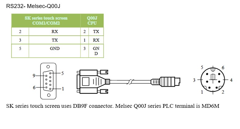 SK series touch screen uses DB9F connector. Melsec Q00J series PLC terminal is MD6M