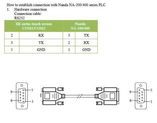 SK series touch screen uses DB9F connector. Nanda NA-200/400 series PLC terminal is DB9M.