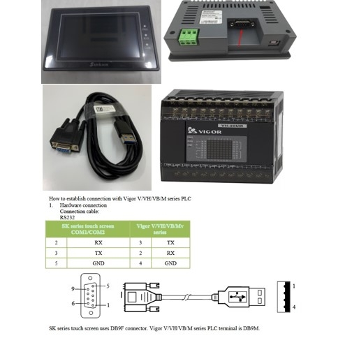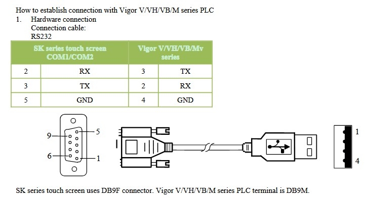 SK series touch screen uses DB9F connector. Vigor V/VH/VB/M series PLC terminal is DB9M