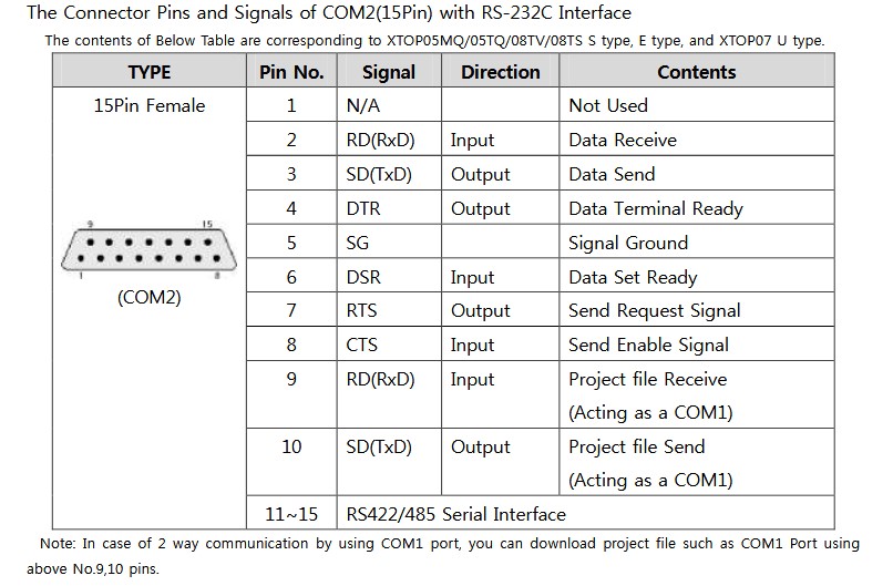 The Connector Pins and Signals of COM2(15Pin) with RS-232C Interface