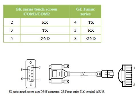 SK series touch screen uses DB9F connector. GE Fanuc series PLC terminal is RJ45