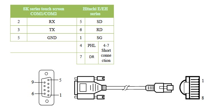 SK series touch screen uses DB9F connector. AB device terminal is RJ45