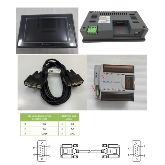 SK series touch screen uses DB9F connector. HollySys LM series PLC terminal is DB9M