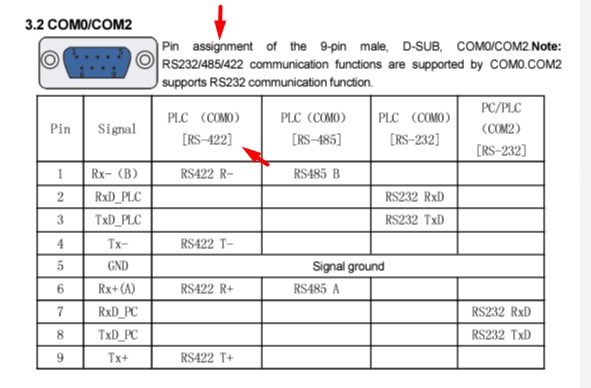 Pin assignment of the 9-pin male, D-SUB, COM0/COM2.Note: