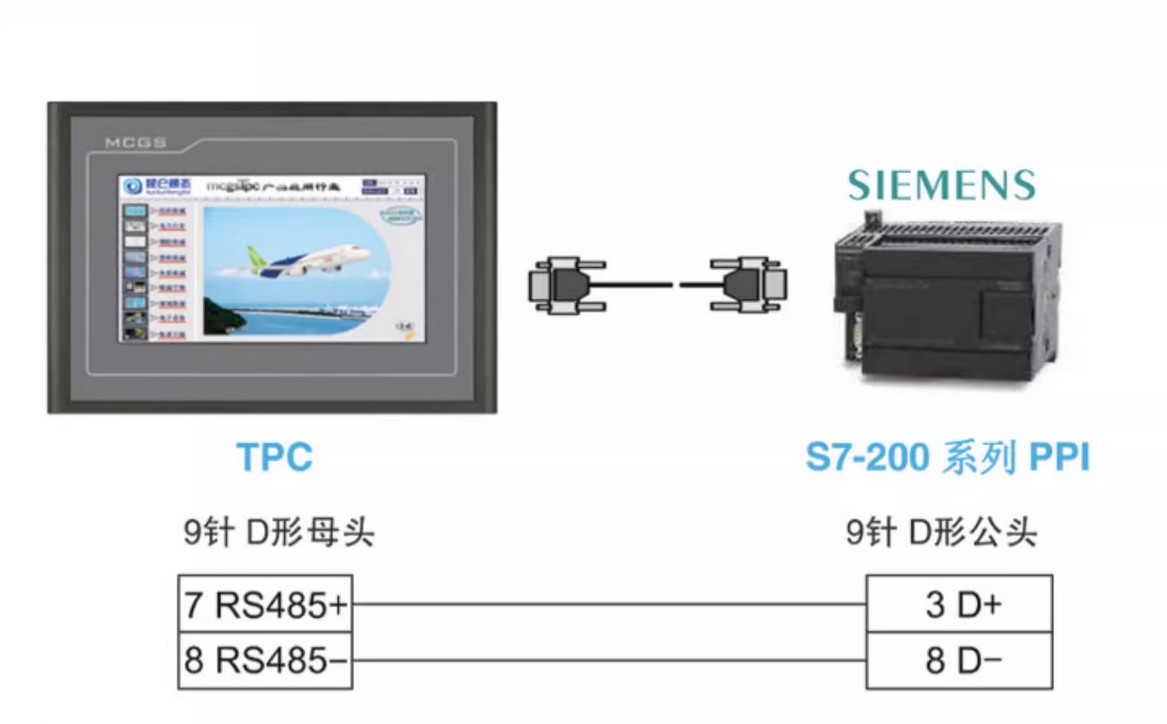 Wiring diagram RS-485 DB9 Male to Female Cable Communication PLC Siemens S7-200 Smart and MCGS TPC1021Nt HMI Touch Panel pinout