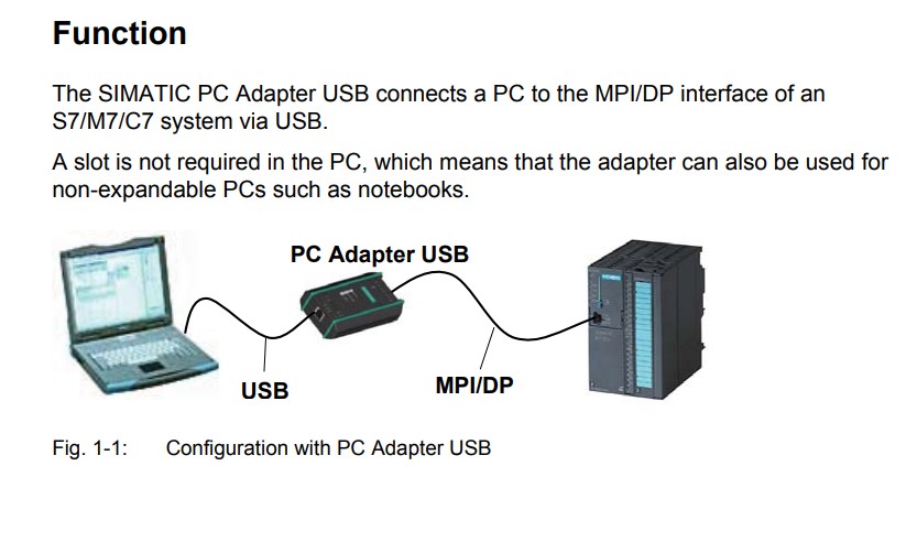 The SIMATIC PC Adapter USB connects a PC to the MPI/DP interface of an