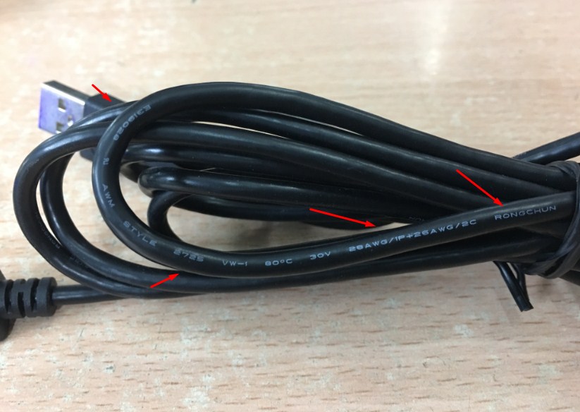Thông số in nổi trên sợi cáp: E319028 AWM STYLE 2725 VW-1 80C 30V 28AWG/IP+26AWG/2C RONGCHUN