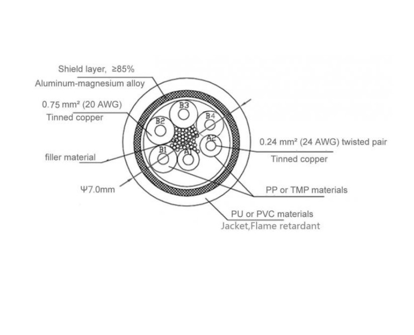 4 x 0.75mm2(20 AWG) stranded (power) 2 x 0.25mm2(23 AWG) twisted pair (data) 6 conductor cable 7mm (0.26 inch) diameter