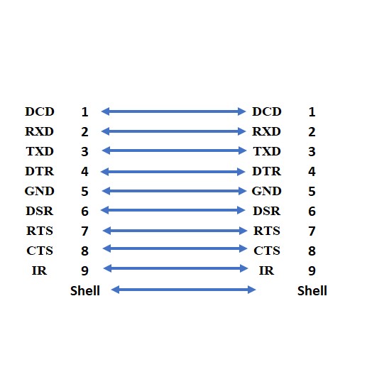 Pin to pin wired as a DE9 rs232 Straight Through COM cord (pinout :1-1, 2-2, 3-3, 4-4,……, 9-9, G-G)