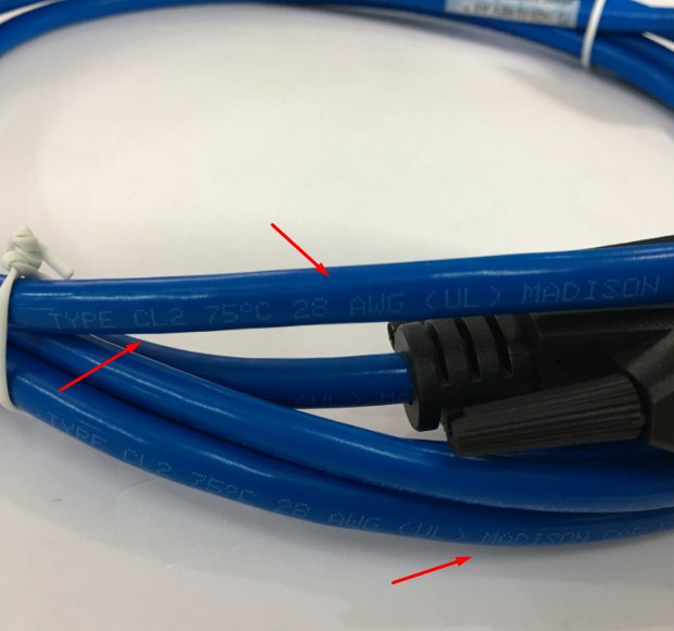 Thông số in nổi trên sợi cáp: TYPE CL2 75C 28AWG (UL) MADISON CABLE (A11) CSA AWM II A/B 75C 300V FT4—ROHS COMLIANT