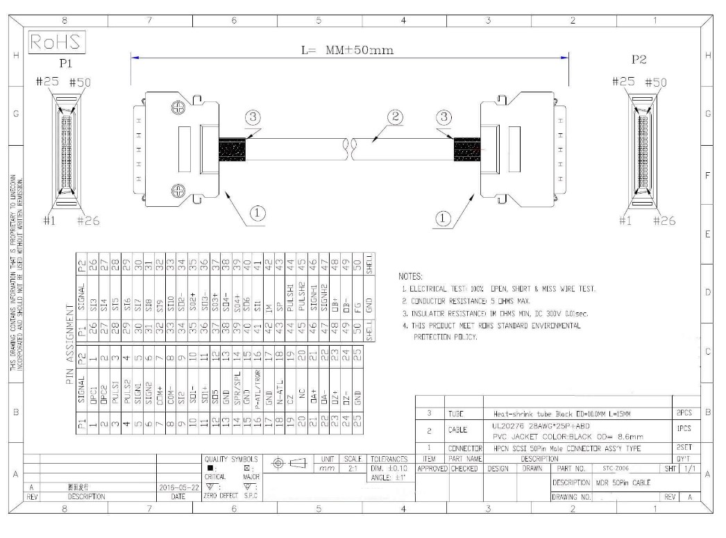 Wiring diagram SCSI I/O Signal MDR 50 Pin Male to Male Straight Connector 3M With Latch Clip Screw
