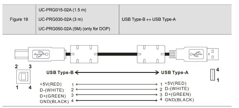 Cáp UC-PRG015-02A kết nối màn hình tích hợp PLC Delta HMI TP70P series TP04P series với Computer USB 2.0 Type A Male to Type B Male 28AWG Black Cable dài 5M