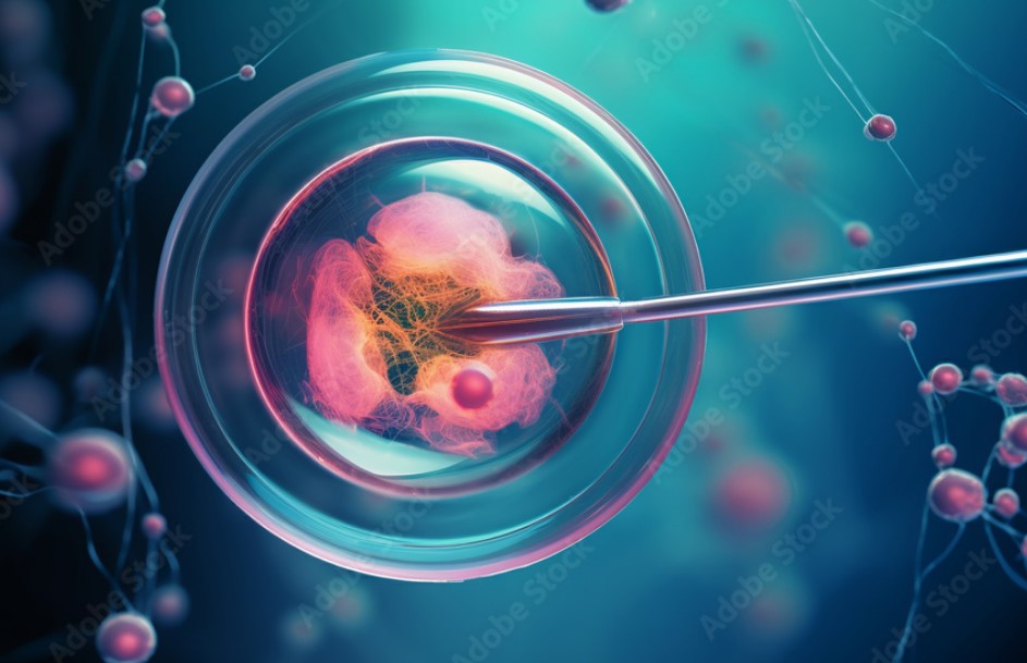 Thụ tinh trong ống nghiệm IVF, In vitro fertilisation. Fertilized egg cell and needle realistic illustration