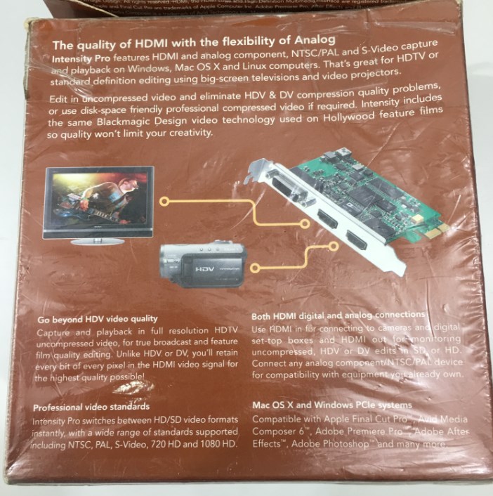 Intensity Pro is the world’s first HDMI and analog component, NTSC/PAL and S-Video PCIe capture and playback card for Windows, Mac OS X and Linux computers. Intensity Pro is great for HDTV or standard definition editing using big screen televisions and video projectors. Intensity Pro works with uncompressed SD or HD video, and compressed codecs such as DNxHD, ProRes, DVCPRO HD, DVCPRO 50, JPEG, HDV and DV! Intensity Pro is a professional editing card featuring maximum real time effects in Avid Media Composer 6™, Apple Final Cut Pro™ and Adobe Premiere Pro™, with full support for both uncompressed and compressed AVI and QuickTime files. Intensity Pro also has full integration with Adobe After Effects and Photoshop.