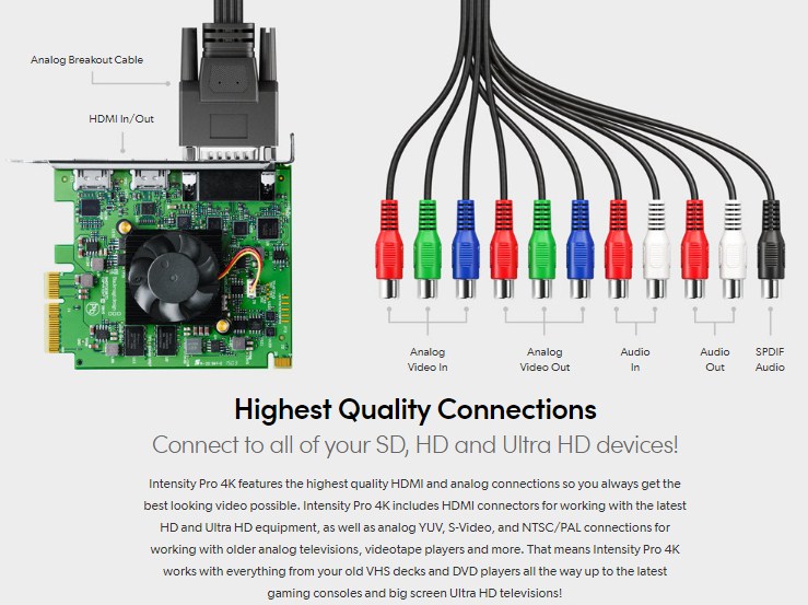 Intensity offers the flexibility of working with compressed and uncompressed video in standard definition PAL/NTSC up to full 1080HD video. Now it’s possible to capture live game play, archive family movies and create amazing videos in full broadcast quality video! Blackmagic Design’s Media Express software is included for a complete capture and playback solution without the need for any additional software.