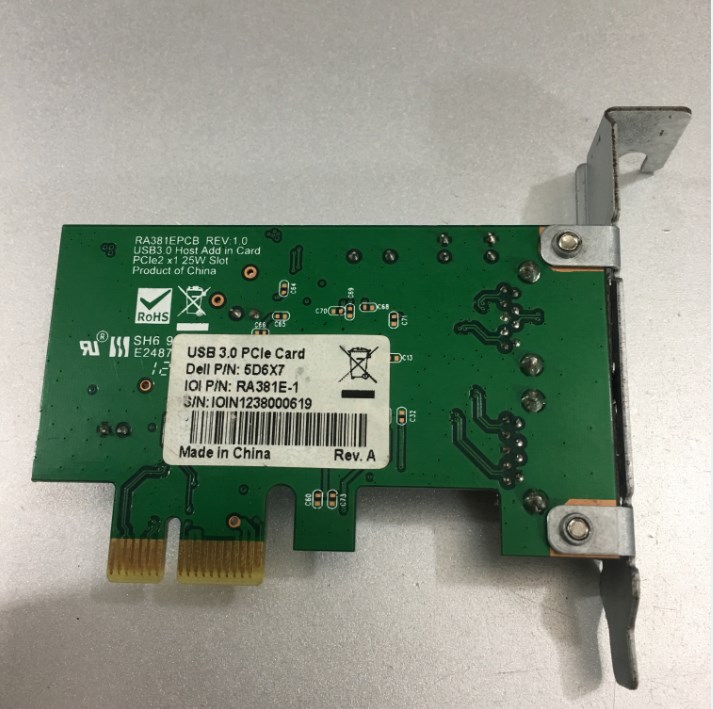 CCard PCI Express to 2 Port USB 3.0 Super Speed 5Gbps Dell 5D6X7 For Computer Desktop Small Form SFF tương thích với PCI Express x1, x2, x4, x8, x16 và khe cắm card màn hình x16. Đa số các bo mạch chủ hiện nay không được trang bị với các cổng nối tiếp hoặc chỉ có một cổng nối tiếp. Với bảng nối tiếp 5D6X7 PCI Express, người dùng có thể thêm 2 cổng USB nối tiếp vào hệ thống cho phép người sử dụng các thiết bị nối tiếp thêm trên cổng USB.…..Do đặc thù nên card không cắm được cho cây Desktop MT không thường, vì thanh chặn Computer Desktop SFF PC Card dài 8 Cm trong khi PC Desktop MT thông thường thanh chặn Card dài 12 Cm