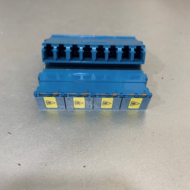 LC multimode enhanced LC adapter with 8 ports that accept 8 simplex connectors, 4 duplex connectors or a combination of the two for flexible design. These 8 port LC multimode enhanced LC adapters have a 6 position tuning feature to optimize insertion loss performance, safety shutters for laser eye safety protection when the adapter is not fully populated, ceramic alignment sleeves and a snap mount, press to release latching design.