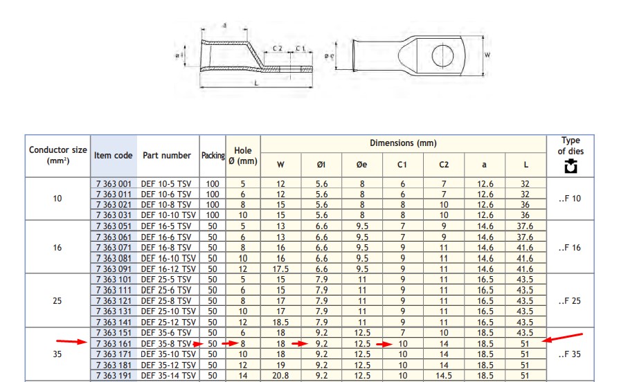 Đầu Cốt Hạ Thế Cosse Solderless Crimp Ring Terminal Chất Lượng Cao Mecatraction DEF35-8T M8 Stud Size to 35mm² Wire Size E-Cu 50 PCS/Box đầu cuối vòng uốn hình ống chất lượng cao, còn được gọi là đầu nối vòng hoặc vấu cáp. Đầu nối uốn vòng chịu lực nặng được sử dụng để kết nối cáp nhiều sợi với đinh tán hoặc trụ trên một bộ phận điện như đầu cực pin. Thiết bị đầu cuối vòng hình ống này được làm từ đồng có thành dày, chịu lực nặng, dẫn điện cao và được mạ thiếc. Sau khi được uốn chính xác vào cáp, đầu nối vòng này sẽ cung cấp kết nối điện an toàn và đáng tin cậy.
