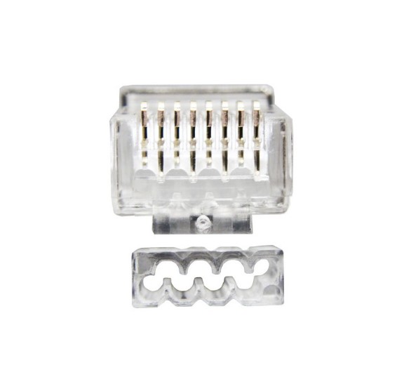 These RJ45 connectors are designed to work specifically with CAT 6, CAT 6A, and CAT 7 cable. These RJ45 connectors are gold plated and work with solid and stranded cable. They have 8 pins and 8 conductors (8p8c). The inserts are also included—they’re part of the design. The wire alignment insert provides an efficient cable assembly.