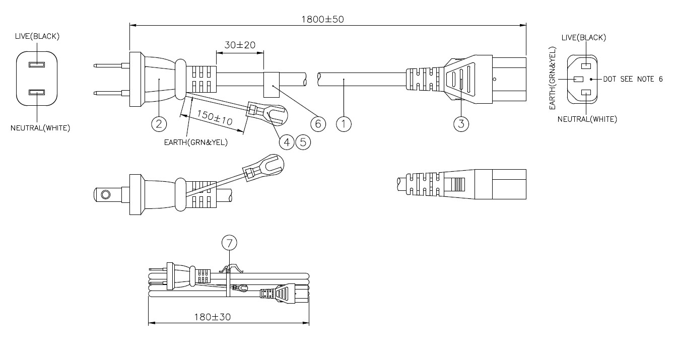 5Ft IEC-60320 C13 to JP JIS8303 Power Cord Ground 14AWG Japan Universal