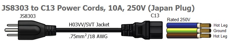 Dây nguồn chuẩn Japan JIS C 8303 IEC C13 được sử dụng chủ yếu Nhật Bản, Bắc và Trung Mỹ. Đây là kiểu phích cắm 3 chấu được phát triển theo tiêu chuẩn NEMA 5-15. Nó có 2 chấu bằng kim loại phẳng dẹt dày 1,5mm, cách nhau 12,7mm, có chiều dài từ 15,9 đến 18,3mm và chiều rộng 6,3mm. Chấu thứ 3 là một thanh kim loại hình trụ có đường kính 4,8mm. Chấu thứ 3 này dài hơn 2 chấu phẳng 3,2mm để đảm bảo thiết bị được nối đất trước khi 2 chấu còn lại có điện. Khoảng cách giữa chấu nối đất và 2 chấu còn lại là 11,9mm. Cáp thường được dùng cho các bộ phân phối điện UPS và PDU nhập về theo tiều chuẩn Nhật Bản, Bắc và Trung Mỹ để kết nối nguồn điện với Computer, Switch, Adapter….Chẩn kết nối này được đánh giá an toàn cháy nổ, chống giật khi tiếp súc với thiết bị. Tốn ít diện tích có thể cắm nhiều sợi cáp trên một UPS và PDU. Dây nguồn đa năng bền bỉ này có thể được sử dụng như một sự thay thế hiệu quả về chi phí cho dây nguồn PC hiện tại của bạn hoặc để cắm màn hình, PC hoặc máy in laser vào ổ cắm điện nối đất.