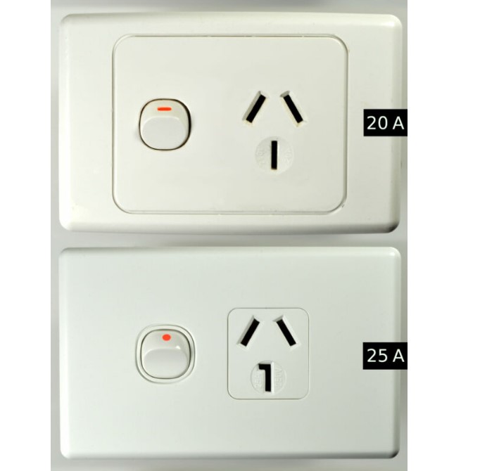 The 25 A outlet has an inverted “L” shaped Earth pin and wider Line and Neutral pins.