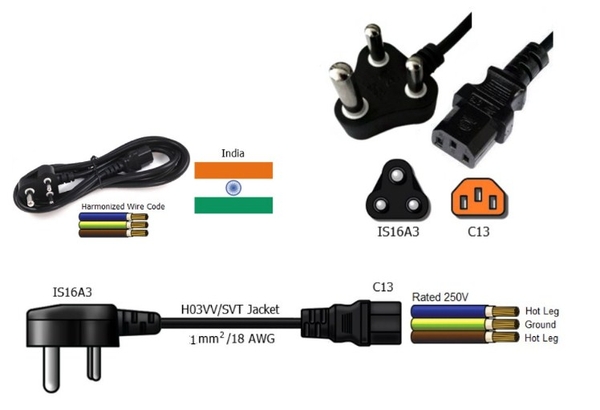 Dây nguồn Longwell LP-67 LS-13 403440-001 India IS16A3 Plug to IEC C13 Power Cord 10A 250V H03VV-F 1.0mm² length 1.8M