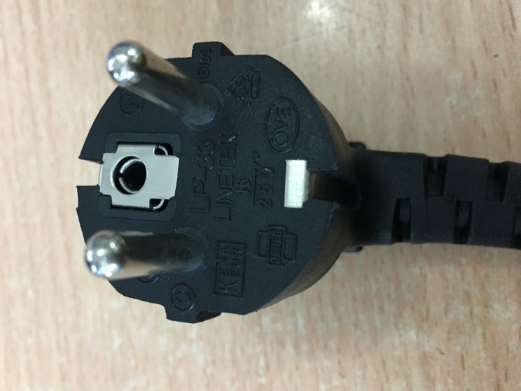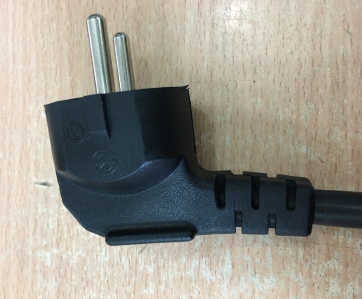Phích cắm điện: Dây nguồn 2 chân tròn có tiếp địa chân cắm chữ L vuông góc 90 độ
