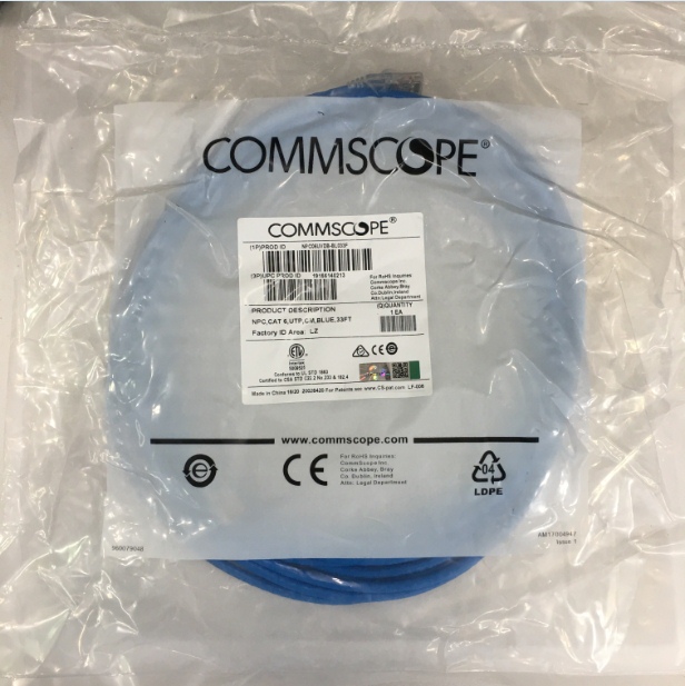 Dây Nhẩy RJ45 Patch Cord OEM COMMSCOPE CAT 6 U/UTP NPC06UVDB-BL033F Straight Through Cable 4PR 24AWG Blue Length 10M đảm bảo khả năng hiệu suất cao cho các ứng dụng Ethernet yêu cầu của bạn, chẳng hạn như Power-over-Ethernet, sử dụng cáp 24AWG đường truyền băng thông GigaSPEED cáp màu xanh. Hỗ trợ các yêu cầu cấp độ hệ thống hiệu suất cao được tích hợp trong các giải pháp cáp GigaSPEED. Hiệu suất điện được đảm bảo đáp ứng hoặc vượt quá thông số kỹ thuật ANSI / TIA-586-C.2 Loại 6 và ISO / IEC Loại 6 / Loại E